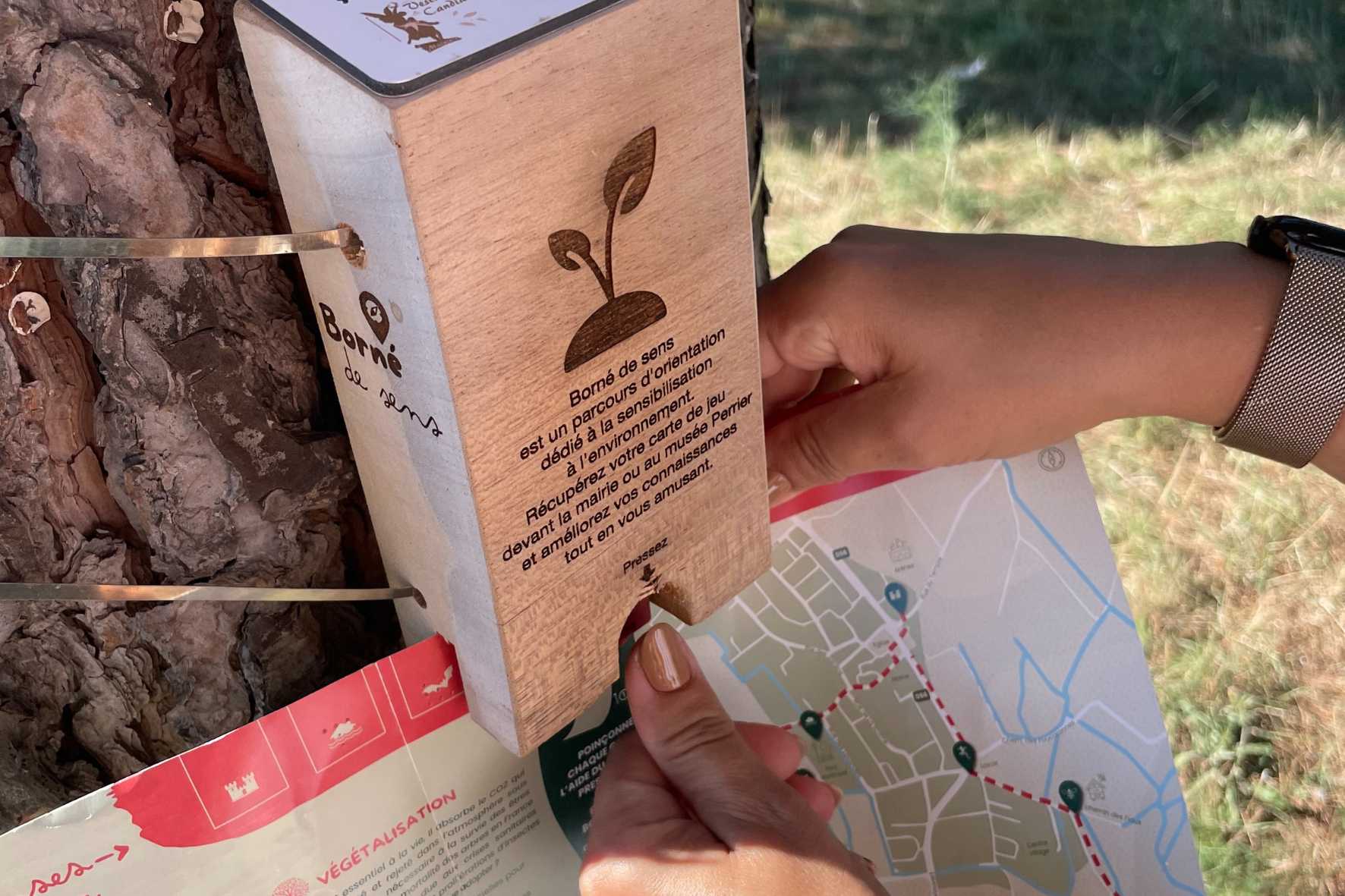 Chaque borne est associée à une question avec réponse à choix multiples sur la thématique environnement (végétaux, pollution, climat, biodiversité...) accessible à tout âge. Les bornes ont été fabriquées dans le Gard, sur le principe de l’économie circulaire, le bois est issu de bois de déchets de l’industrie de charpente et les plaques en dibond de récupération.